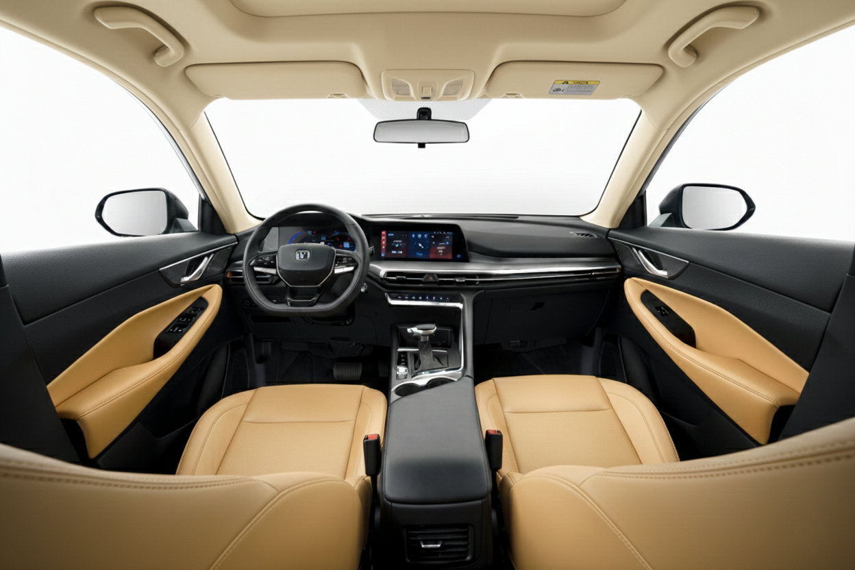 Enterijer je fokusiran na komfor, tehnologiju i sofisticiran ambijent. Kabina ima prostrana kožna sedišta sa grejačima, multifunkcionalni volan i automatsku klimu sa zadnjim AC ventilacionim otvorima i sistemom jonizacije vazduha sa plazma generatorom za osećaj svežine poput šumskog vazduha. Uključeni su 10″ multimedijalni touchscreen ekran, digitalna instrument tabla i bežični punjač telefona. Panoramski krov unosi obilje prirodnog svetla i dodatno pojačava osećaj prostranosti i luksuza.